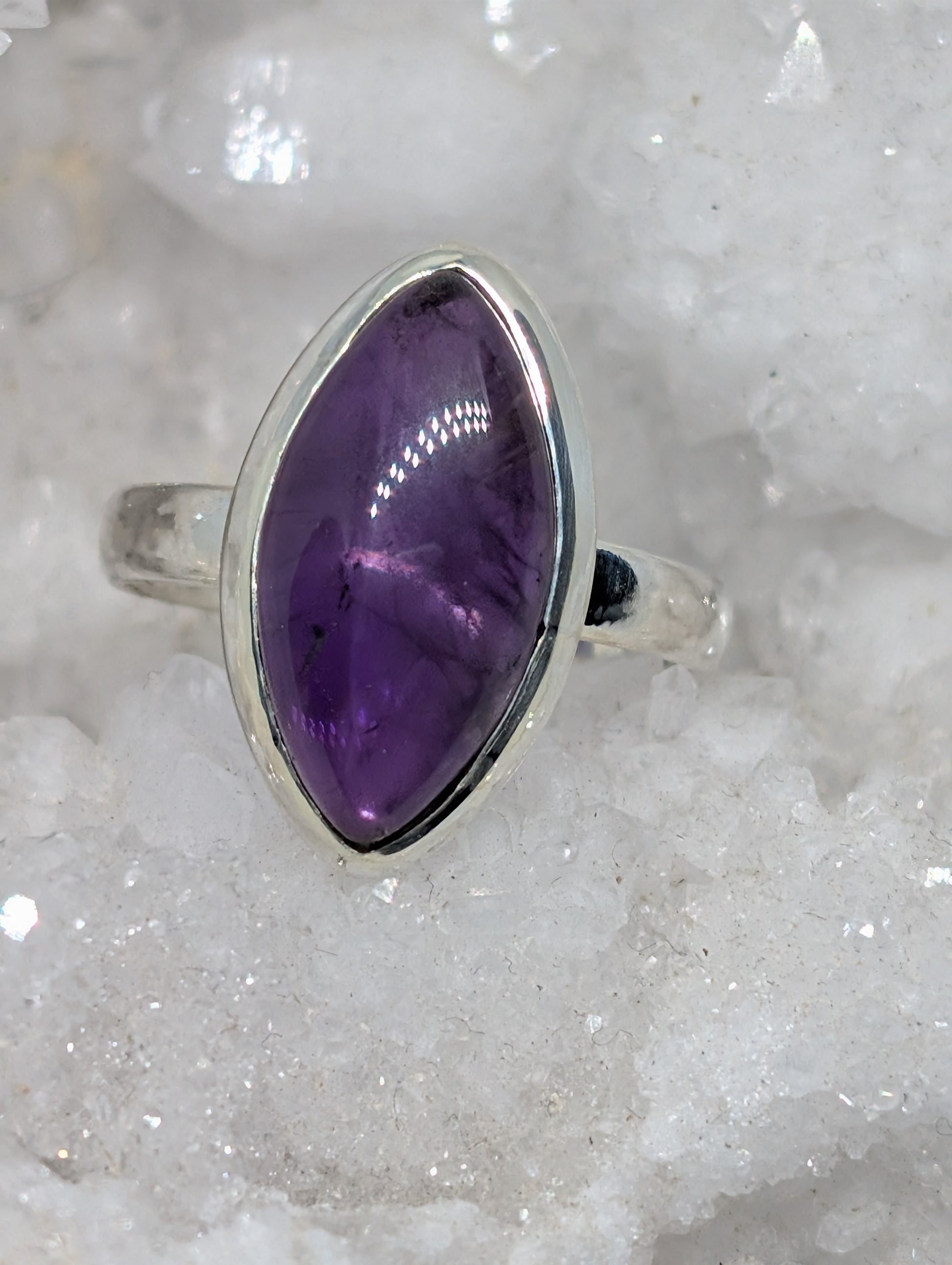- A sterling silver amethyst ring combines the protective and calming energies of amethyst with the balancing properties of silver. Amethyst is known for its ability to relieve stress, enhance intuition, and promote spiritual awareness. It is also associated with emotional healing and protection against negative energies. Sterling silver amplifies amethyst's energy, grounding its calming effects while aiding in emotional balance. Wearing this ring helps foster inner peace, mental clarity, and spiritual growth, making it ideal for meditation and stress relief.