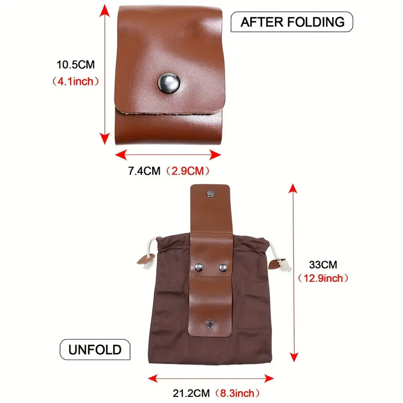 This clever dump pouch transforms from a compact leather-bound bundle into a roomy canvas drawstring bag at a moment’s notice. Designed for quick gathering—be it coins, herbs, or trail finds—it folds neatly away when empty, ready to serve again on your next venture.