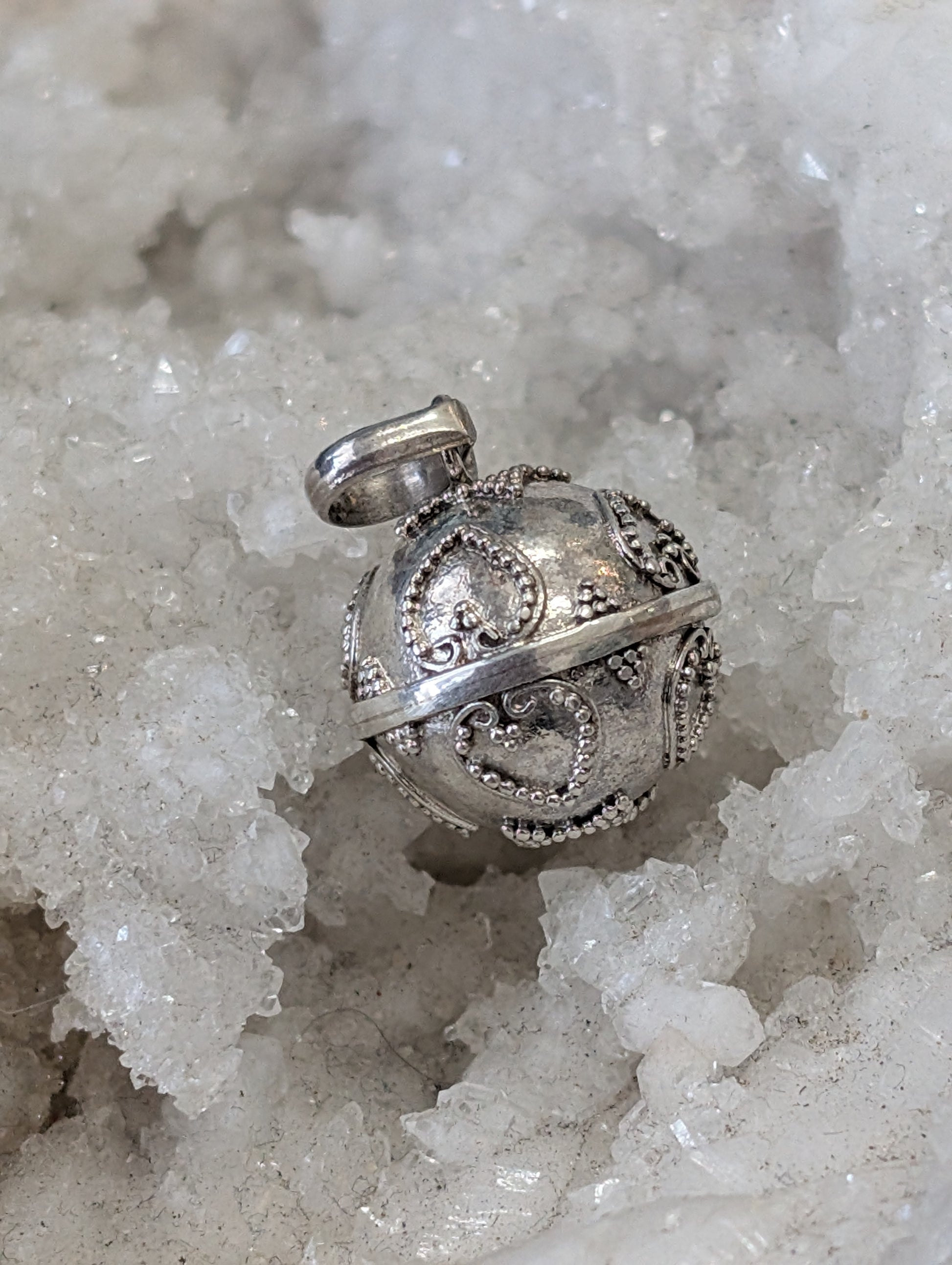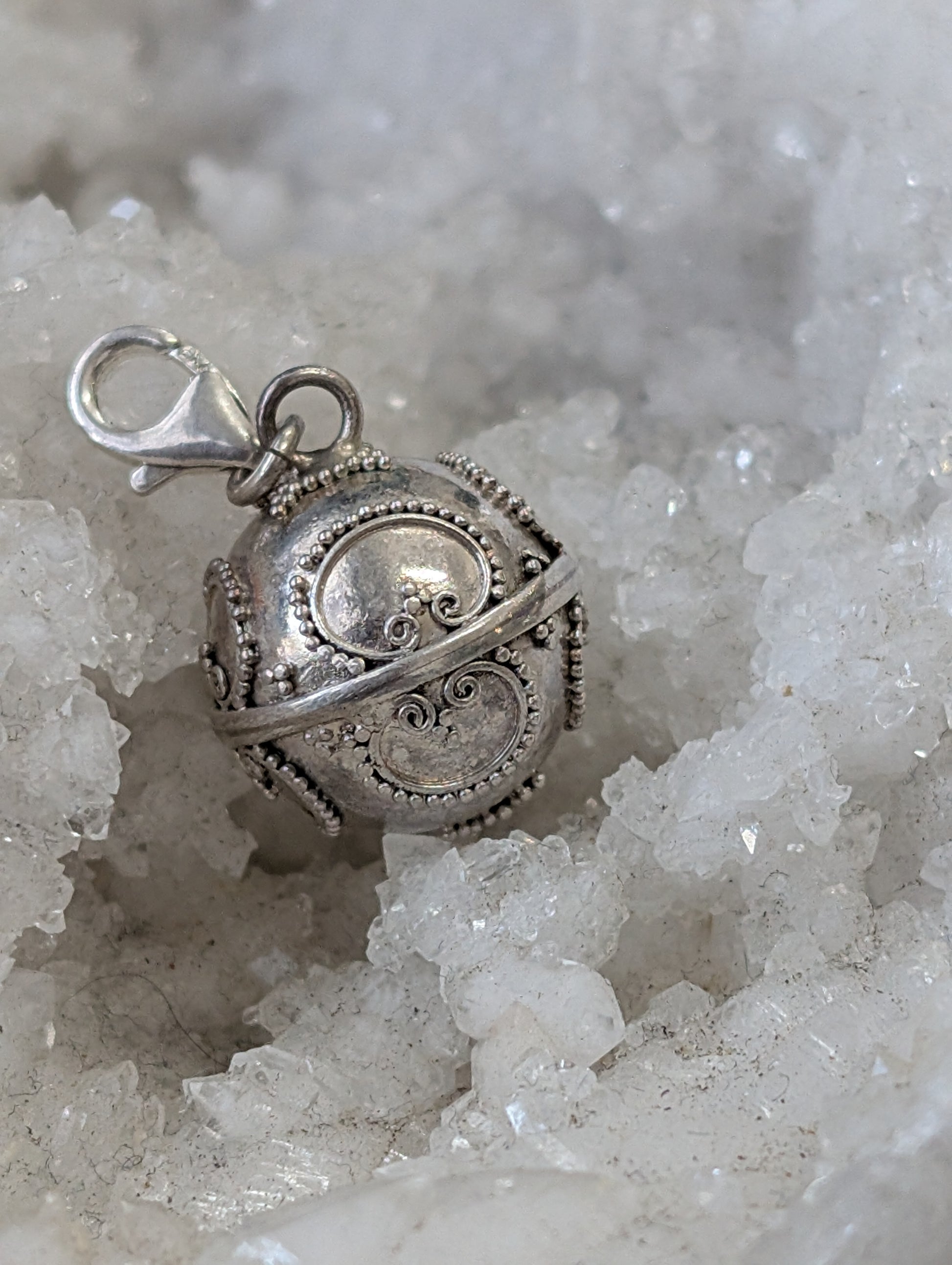 Sterling Silver Harmony Balls are enchanting jewelry pieces known for their soothing sound. Each ball contains a tiny chime that produces a gentle, melodic tone when moved. Crafted from high-quality sterling silver, these harmony balls often feature intricate designs and are sometimes adorned with gemstones. They are traditionally worn by pregnant women to calm the baby with their soft sounds but are also popular as everyday accessories, promoting tranquility and a sense of well-being. A Harmony Ball pendant makes a gentle bell sound, similar to a metal wind chime bumping gently in summer afternoon breeze.