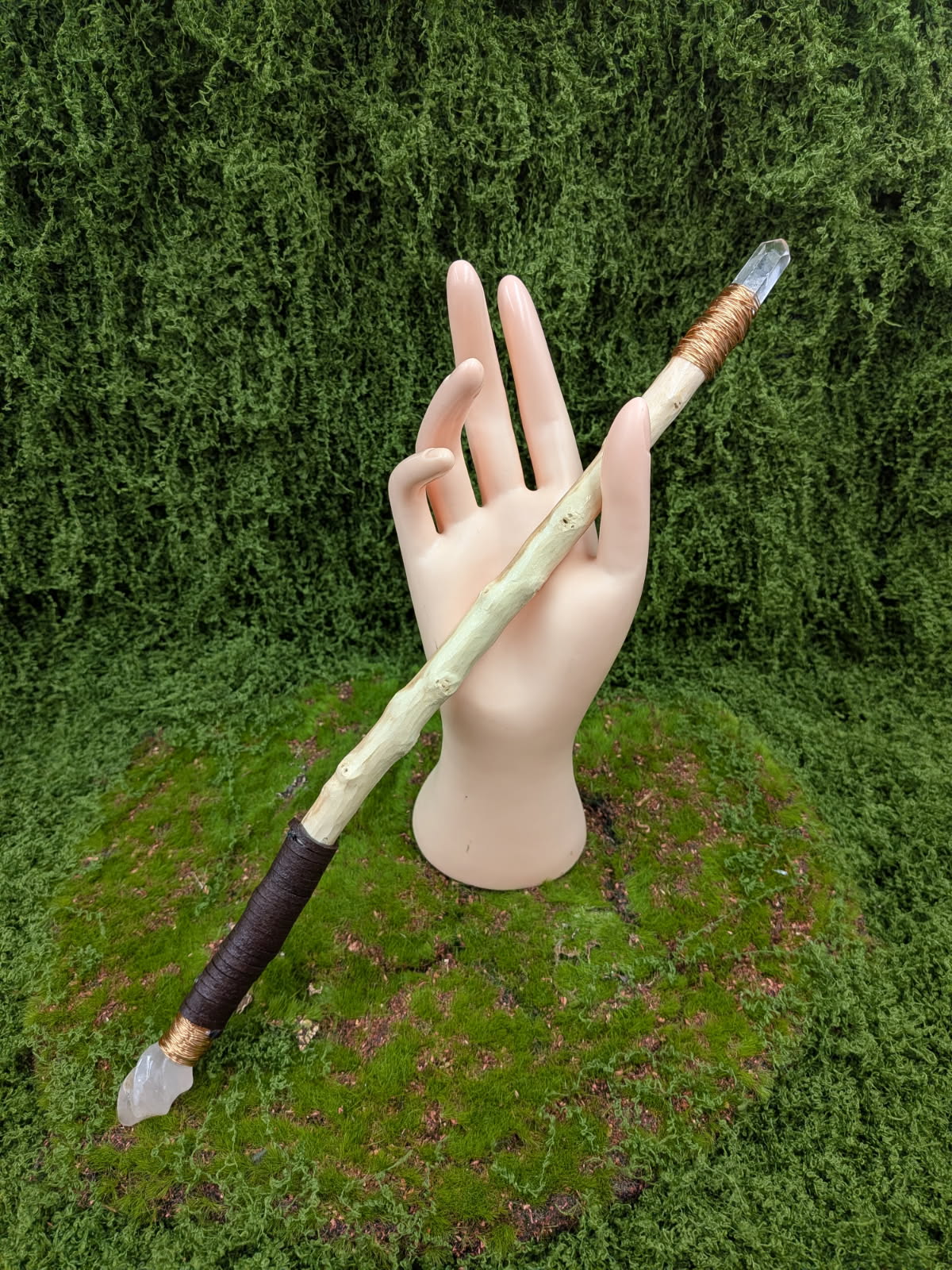 Fashioned from pale wood, The Roselight Spire unites the piercing clarity of a clear quartz crown with the gentle embrace of a rose quartz spiral. Bound in copper to awaken and guide the flow of energy, and gripped in leather for steadfast command, it serves as both beacon and balm—illuminating truth while softening the heart.